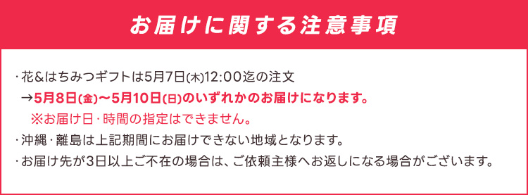 5月7日12:00までのご注文は5月8日~10日のいずれかにお届けになります。 お届け日・時間のご指定は承っておりません。 □【母の日】5/8~10でおまかせ にチェックを入れてください。 ※納品書・明細書等の金額のわかるようなものは一切同梱しておりません。 ※沖縄・離島は上記期間にお届けできない地域となります。 ※お届け先様が3日以上ご不在の場合は、ご依頼主様にお返しする場合がございます。 |